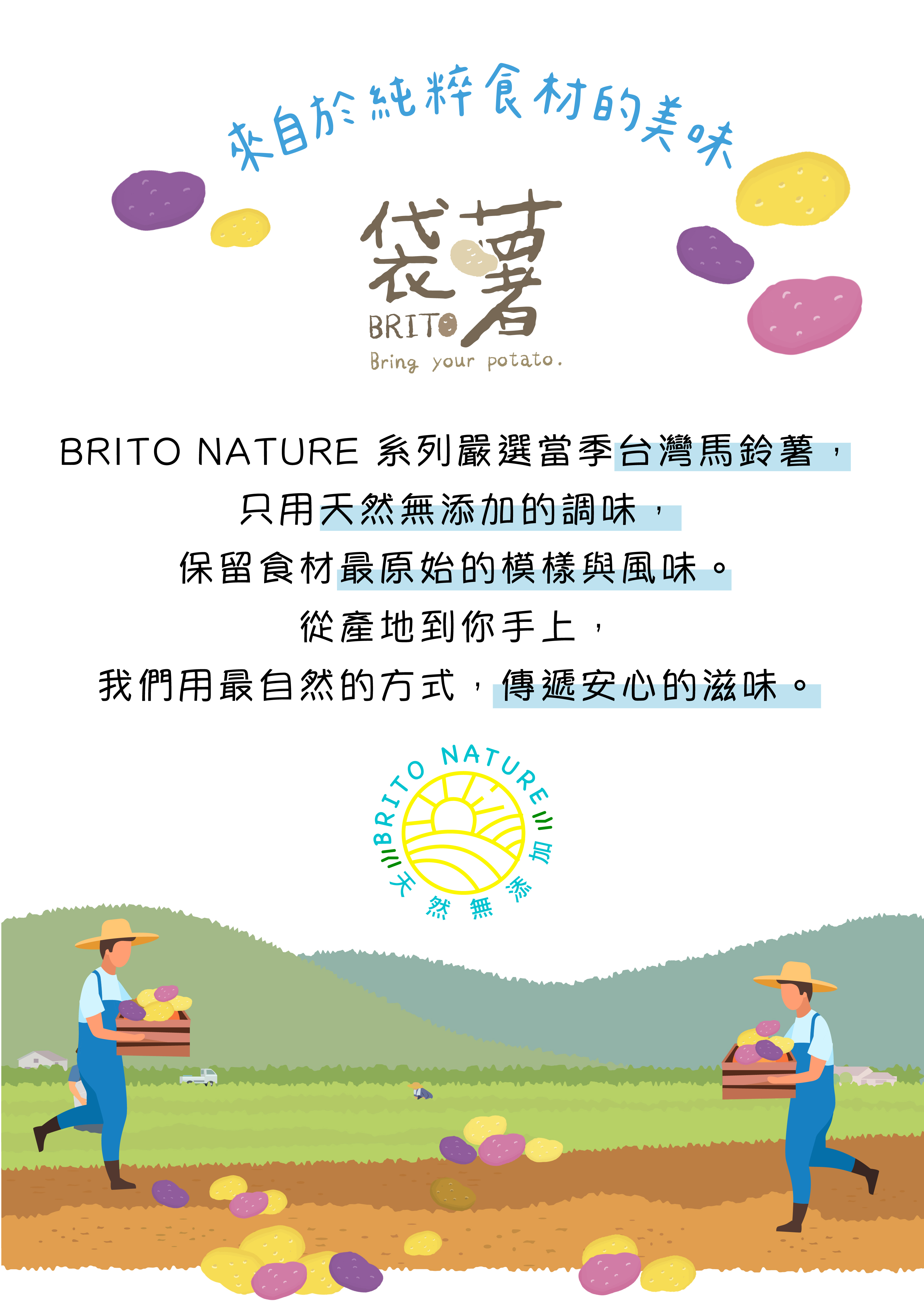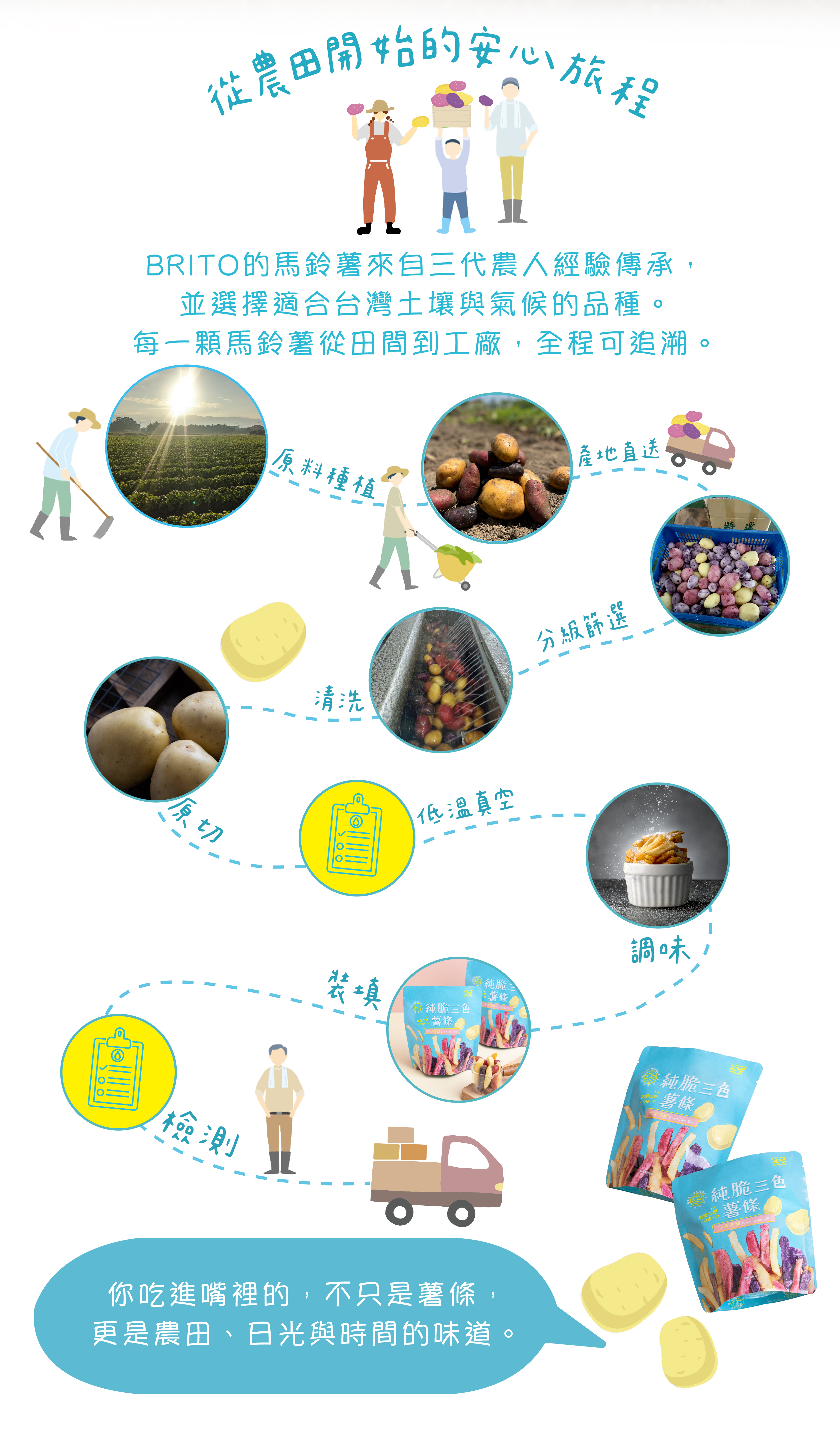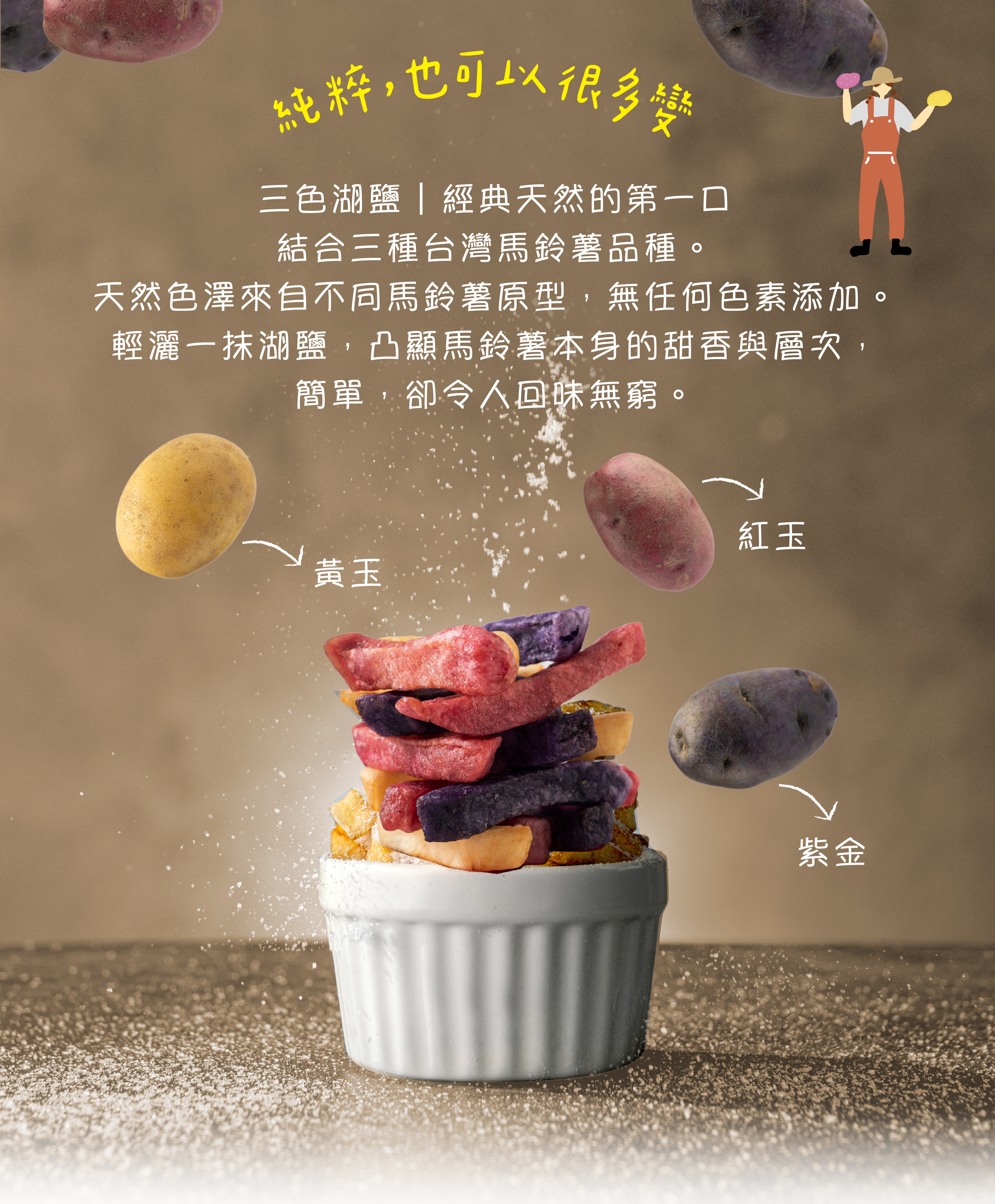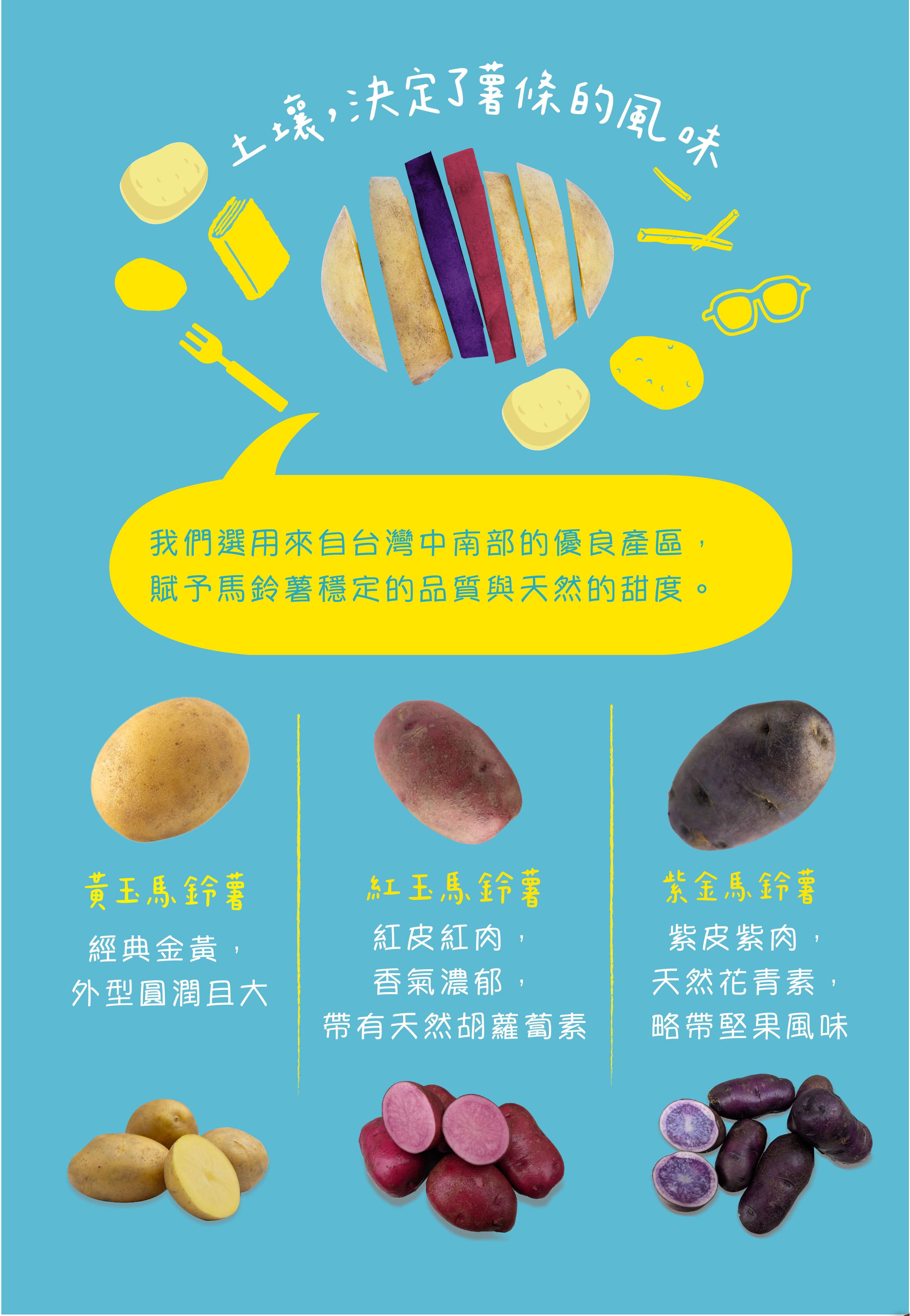嚴選台灣馬鈴薯黃玉、紫金、紅玉,無添加人工色素,讓孩子吃得安心。