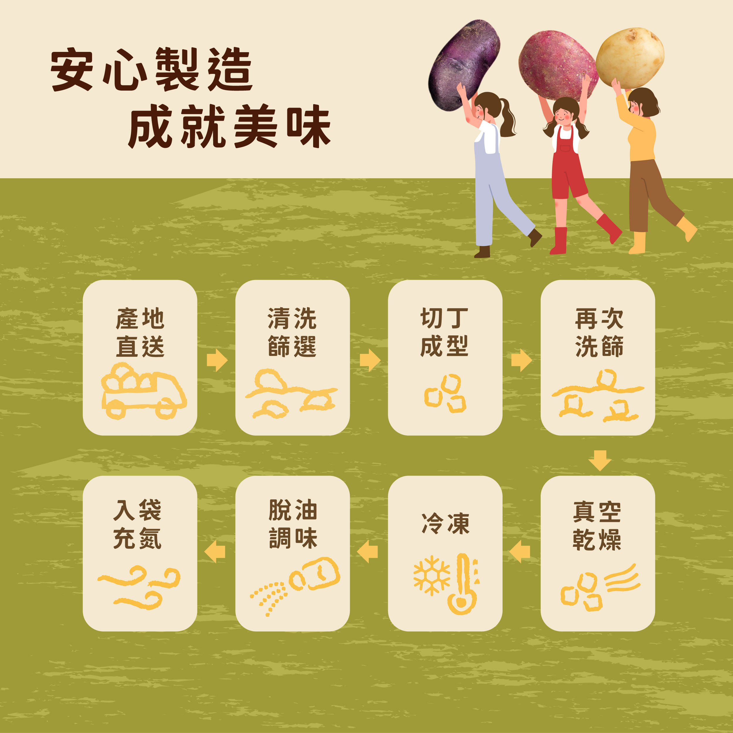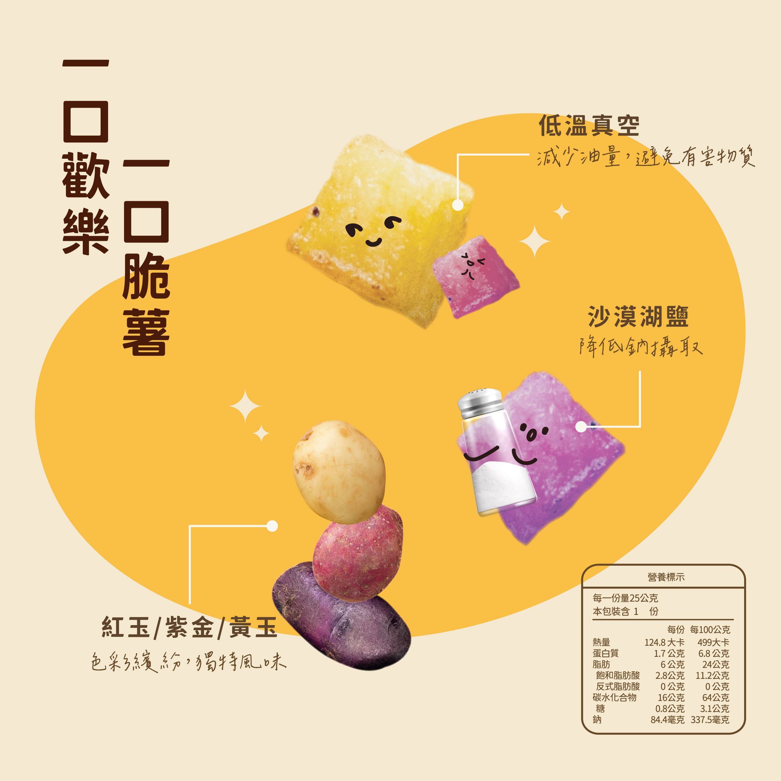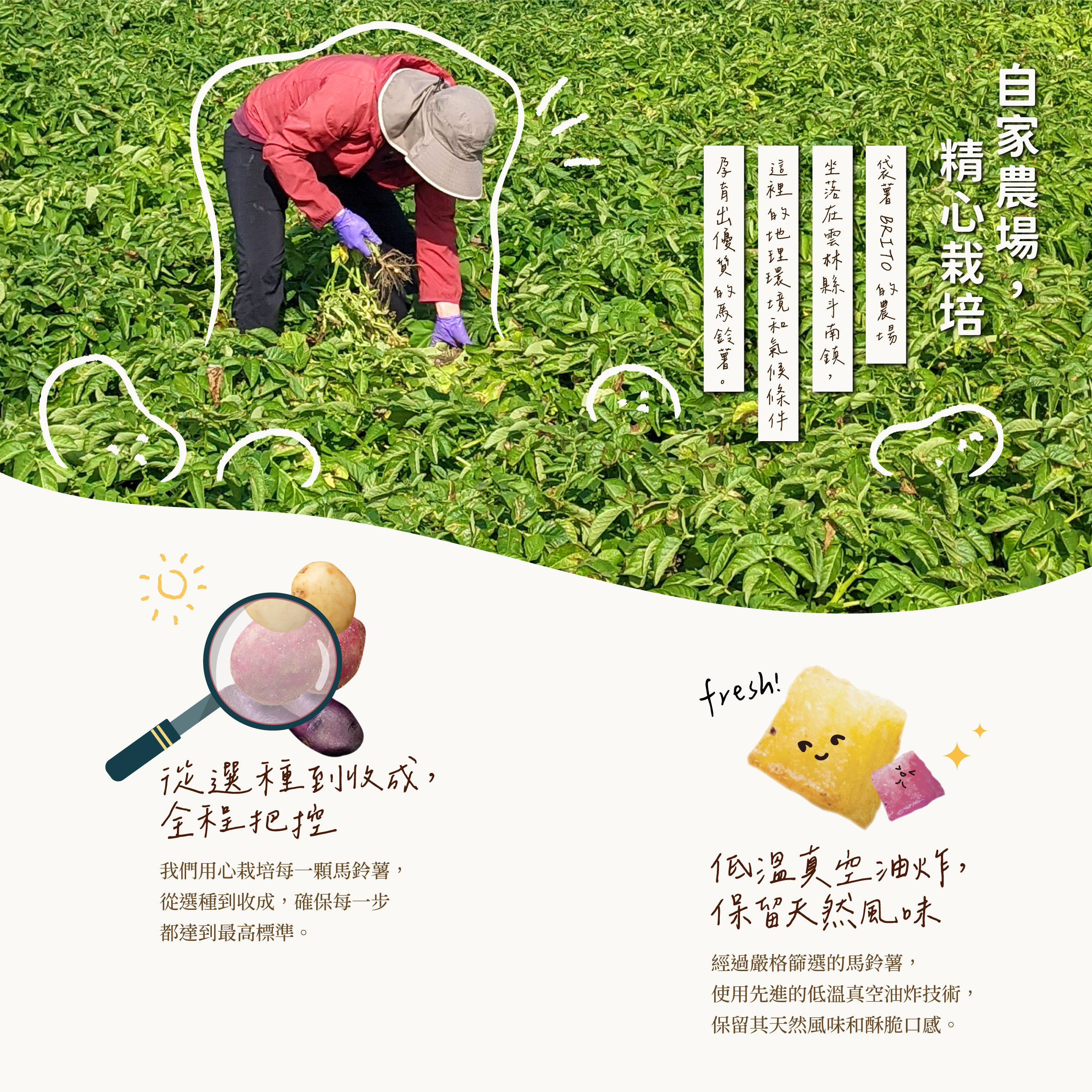 ● 搭配國產稀有紅玉、紫金馬鈴薯,佐以嚴選低鈉沙漠湖鹽,每一口都吃得到馬鈴薯獨特風味